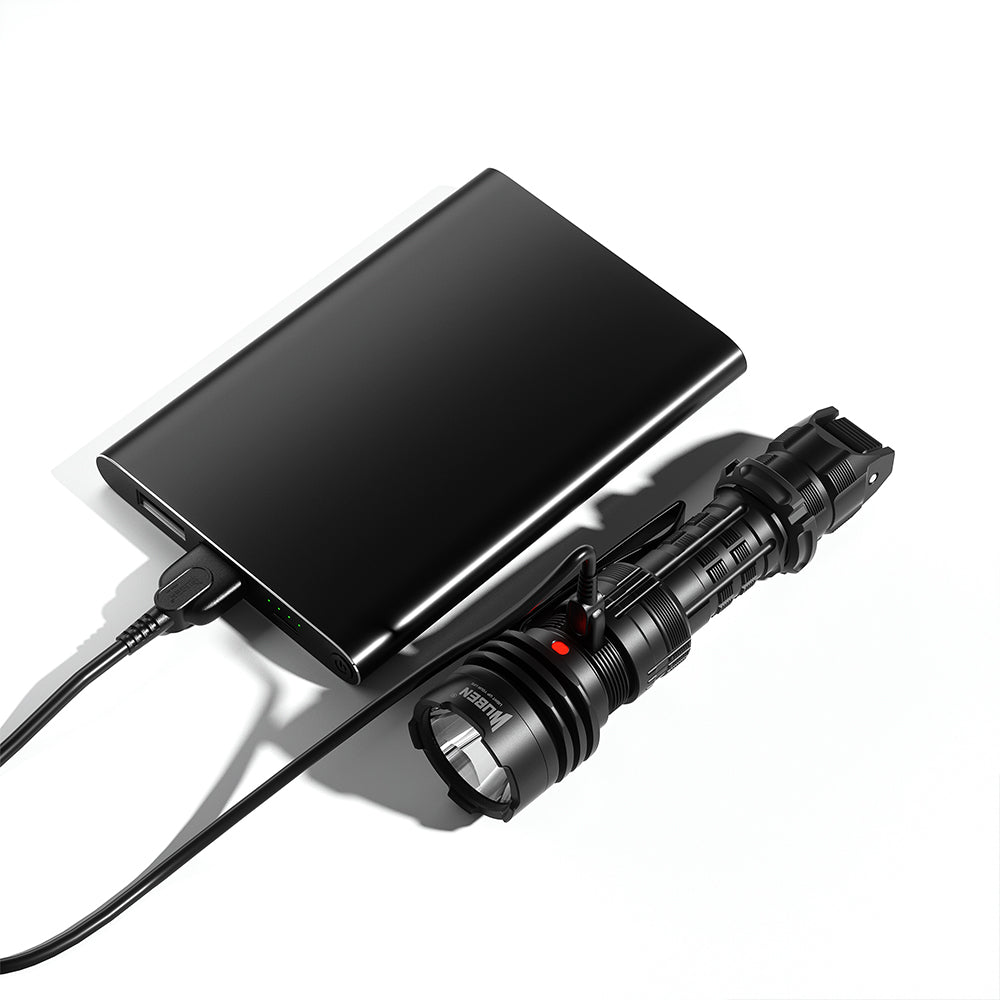 Puerto de Carga USB-C con Sello Mecánico: La T1 funciona con una batería 18650 de 3100mAh con iones de litio, y puede ser cargada con un cable Tipo-C. El diseño de sello mecánico proporciona mejor protección para el puerto de carga contra daños externos, haciéndola más confiable y práctica.